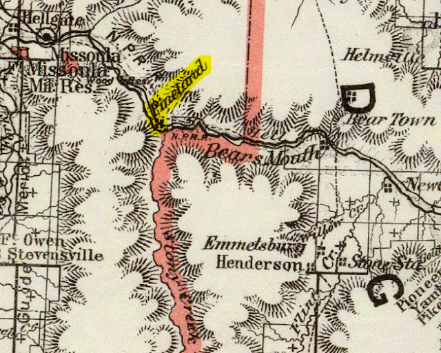 The Pineland post office only existed from July 28, 1882 to April 2, 1883. In the Western Territories in the 1880s, getting the Post Office Department to approve a new post office was easy (Probably too easy) but the Pineland post office made some sense, being halfway between existing post offices in Missoula and Bear's Mouth on (Mail) Route 36123.